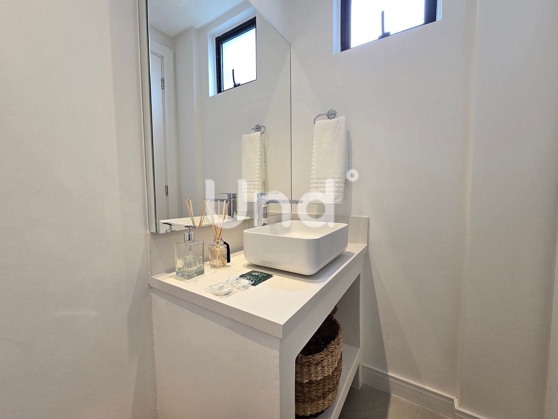 The living room offers a Smart TV, modern sofa, climate controlled wine fridge, side tables, portable fan and reading light. Adjacent to the living area there is 1 guest bathroom, adding extra convenience for daily use.