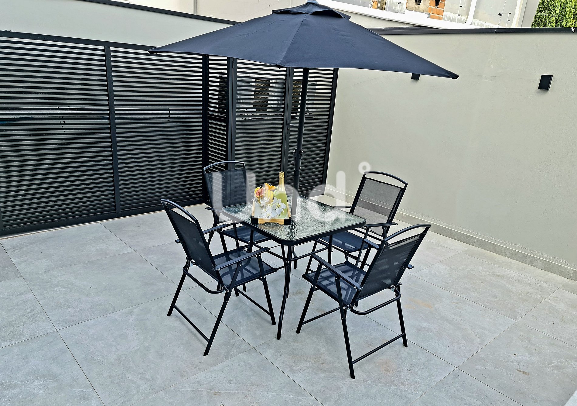 -Private balcony with outdoor table, chair and umbrella.