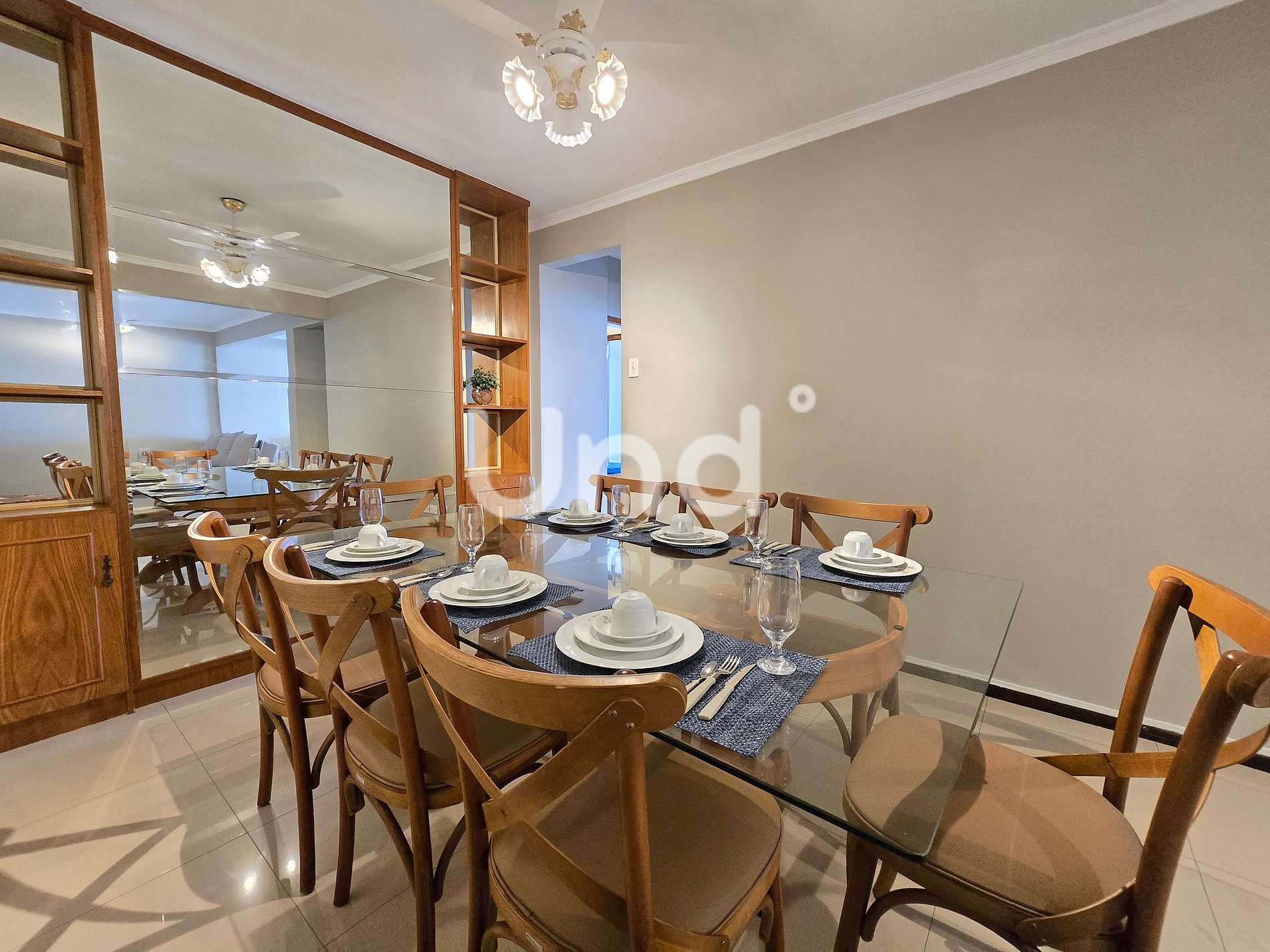 El comedor consta de una mesa con silla para 6 personas y un mueble vajilla con espejo. La sala de televisión tiene un sofá cama.