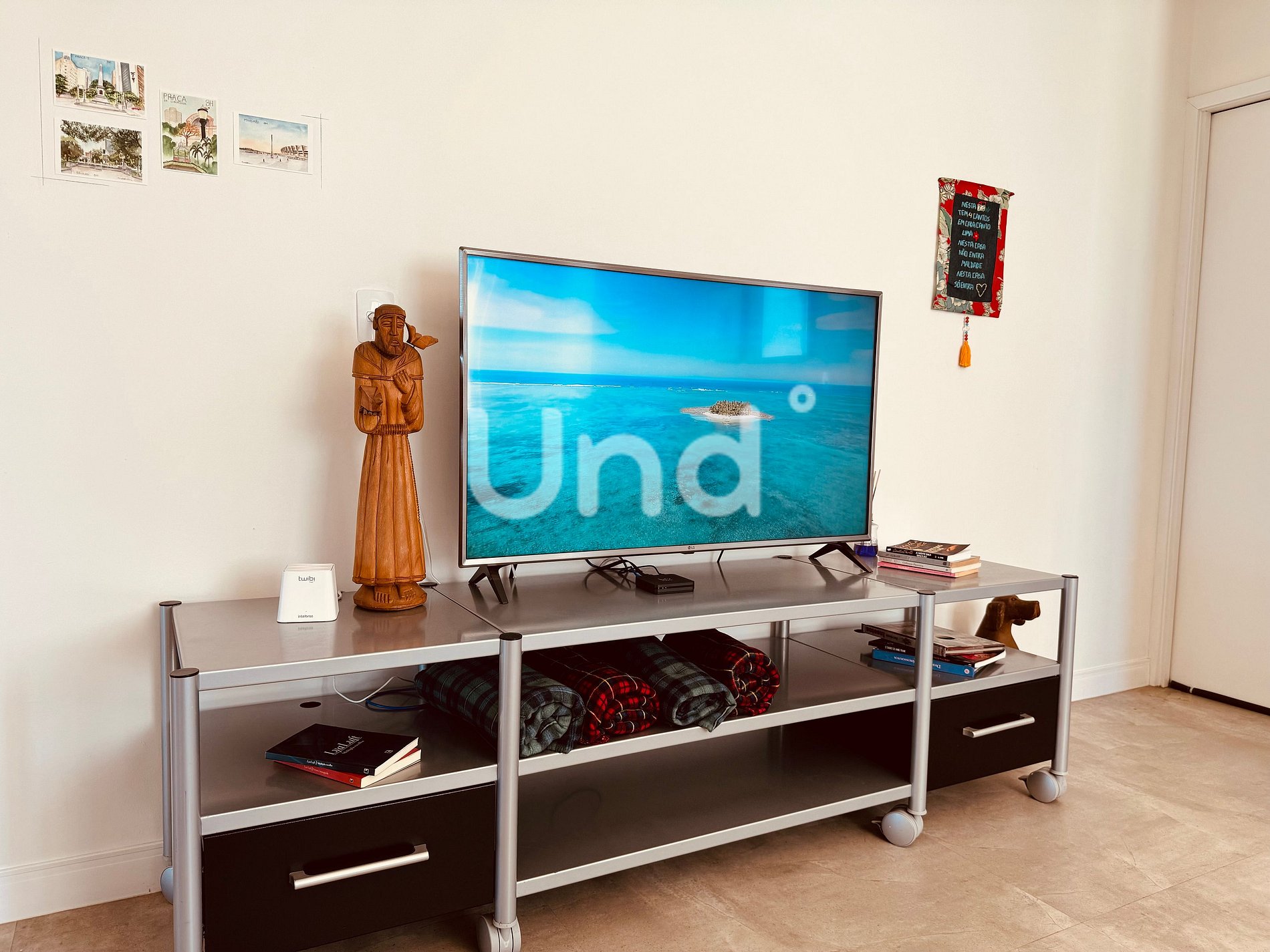 Sala de TV con televisor de 50” y televisor con canales. Aseo al lado de la sala de televisión.