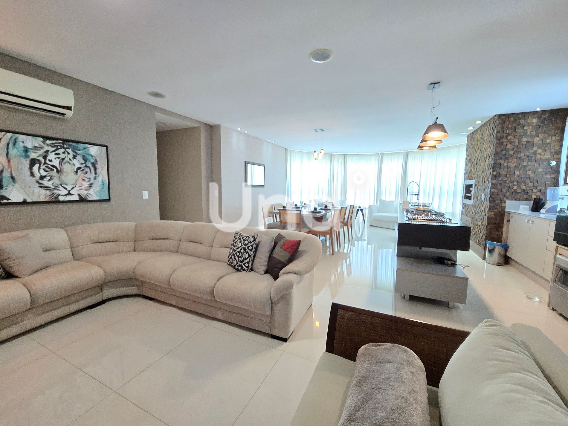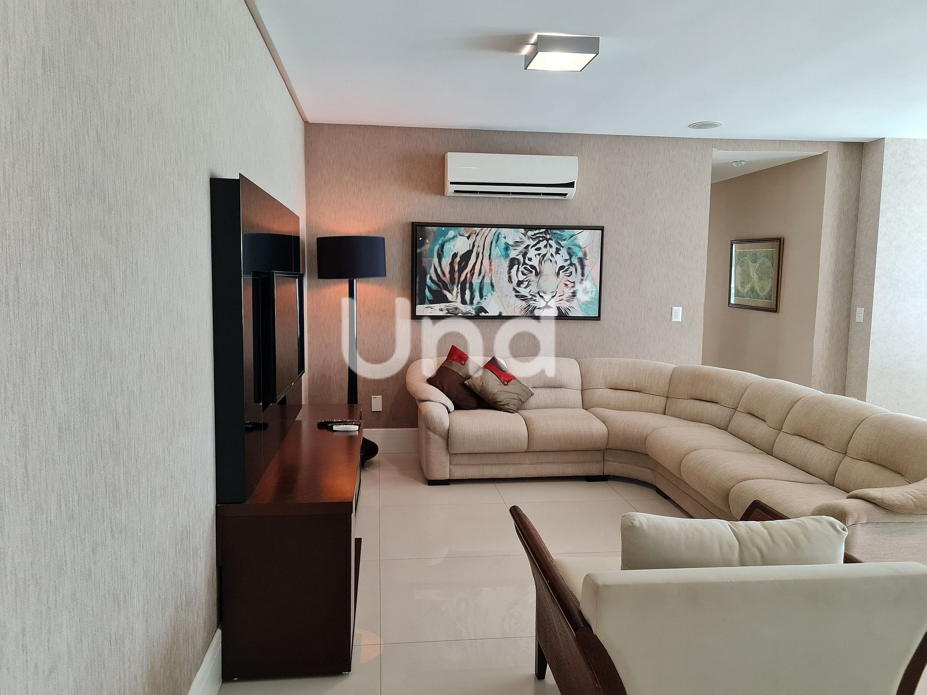Sala de estar: Sofá, poltronas e ar-condicionado (18.000 BTUs).