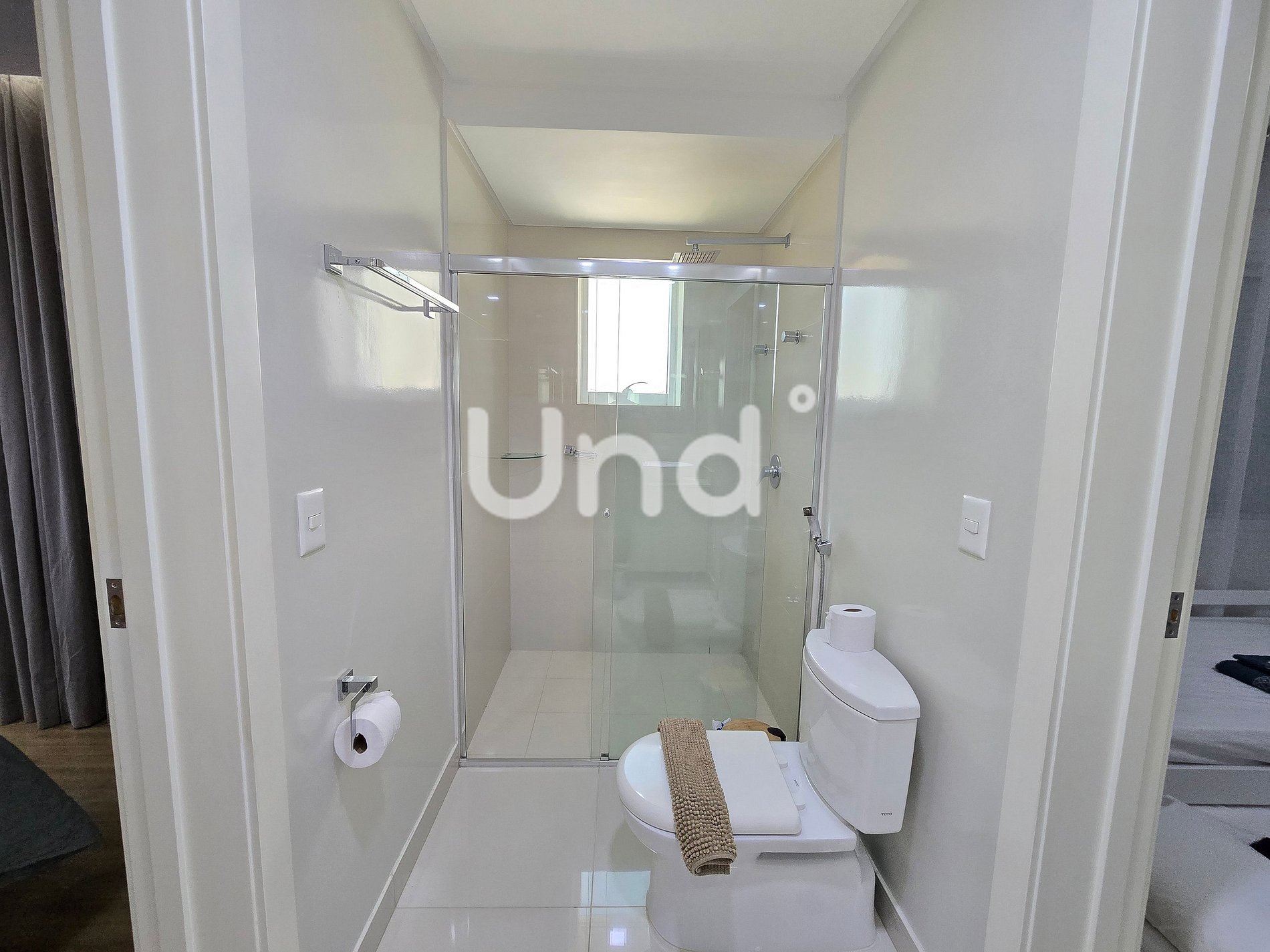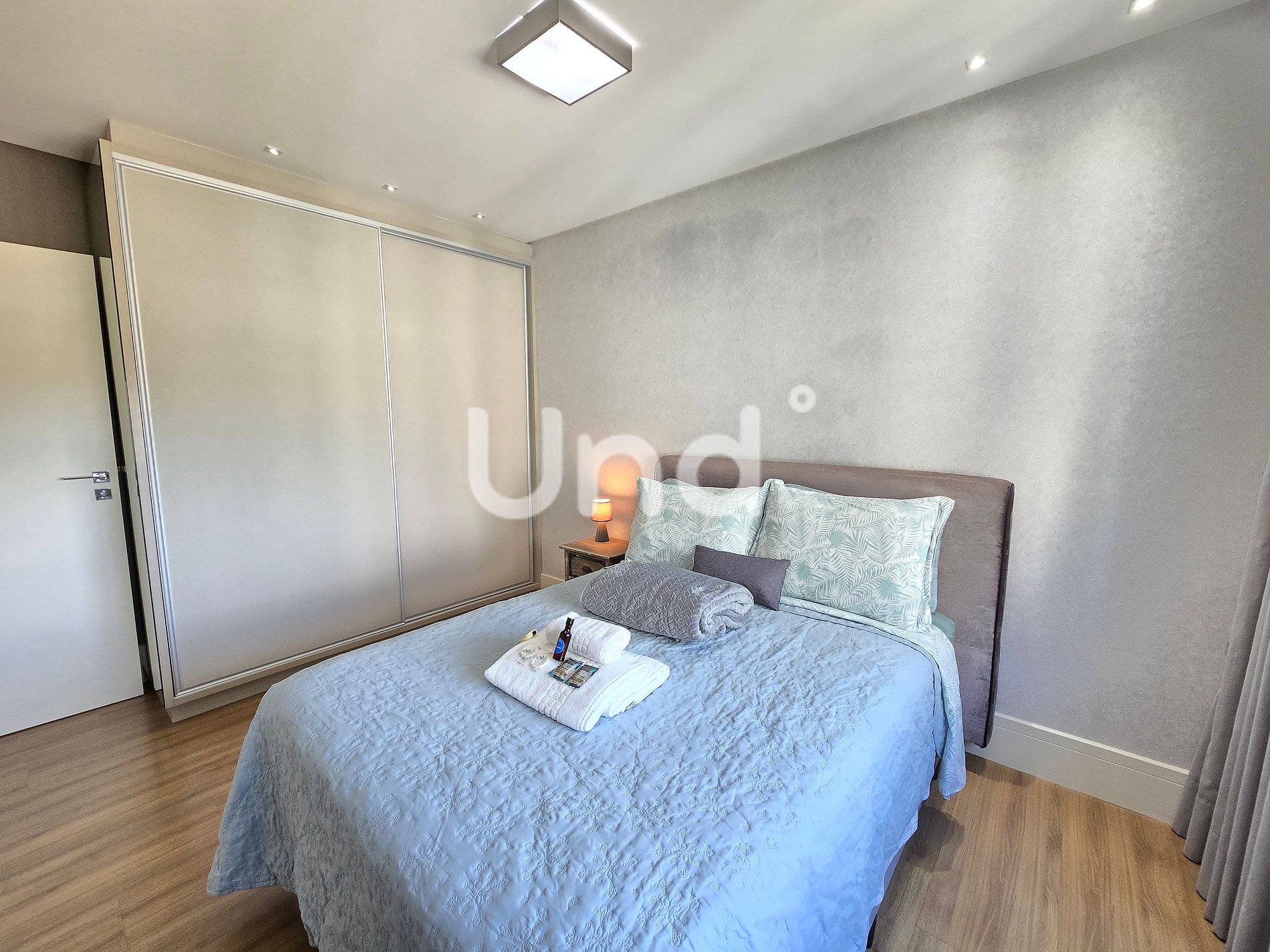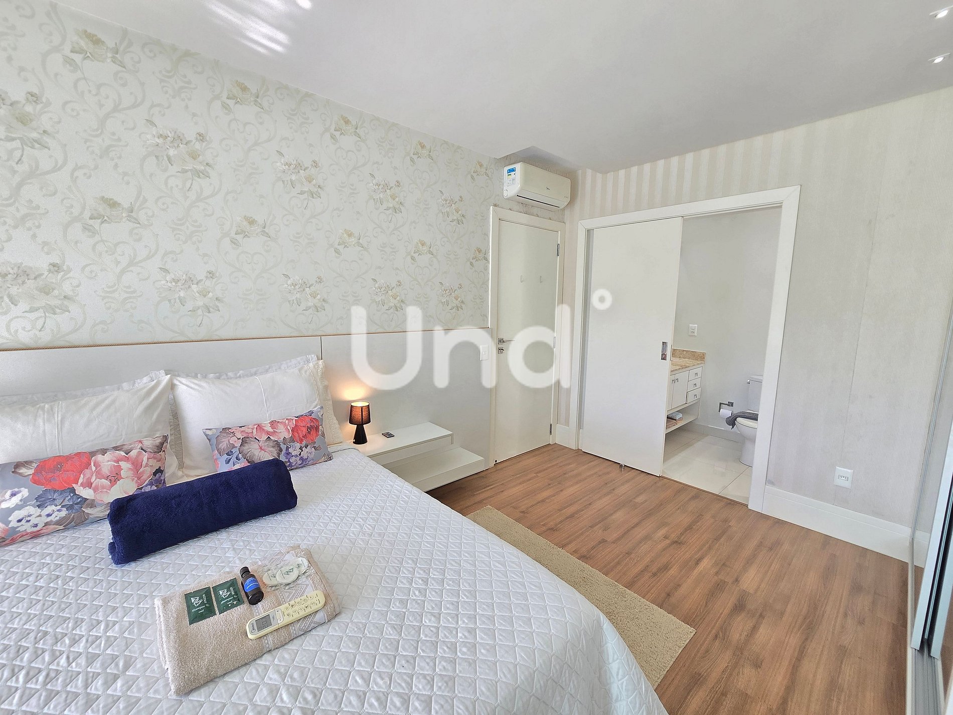 1 Suíte Master: Cama Queen, guarda-roupa, ar-condicionado (9.000 BTUs), banheiro privativo com chuveiro e cromoterapia, além de sacada exclusiva.