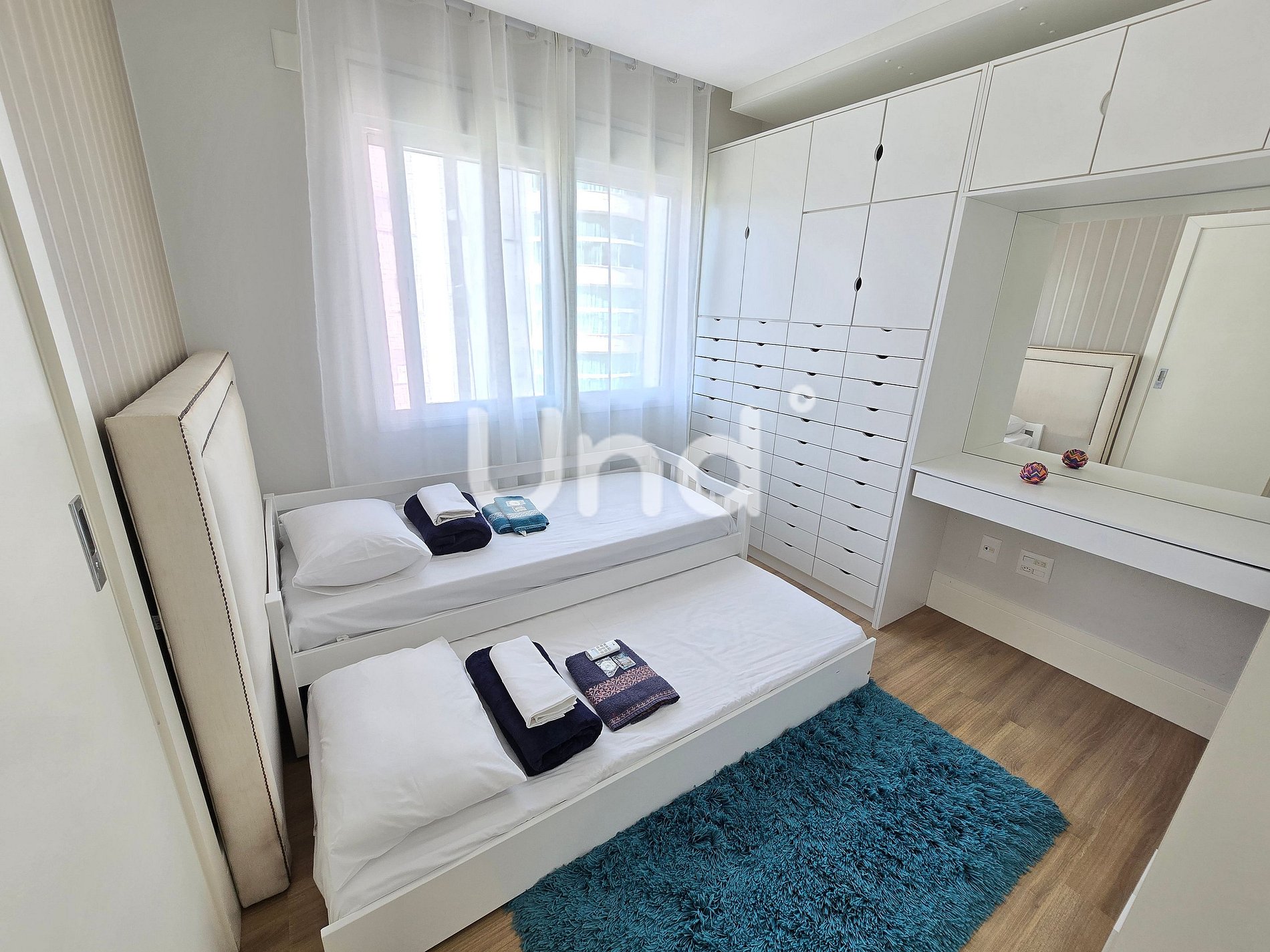 2 Demi Suítes: Primeira Demi Suíte: cama Queen, guarda-roupa, ar-condicionado (9.000 BTUs) e acesso a um banheiro compartilhado com chuveiro; segunda Demi Suíte: duas camas de solteiro estilo sofá-cama, guarda-roupa, mesa de trabalho, ar condicionado frio e ventilador.