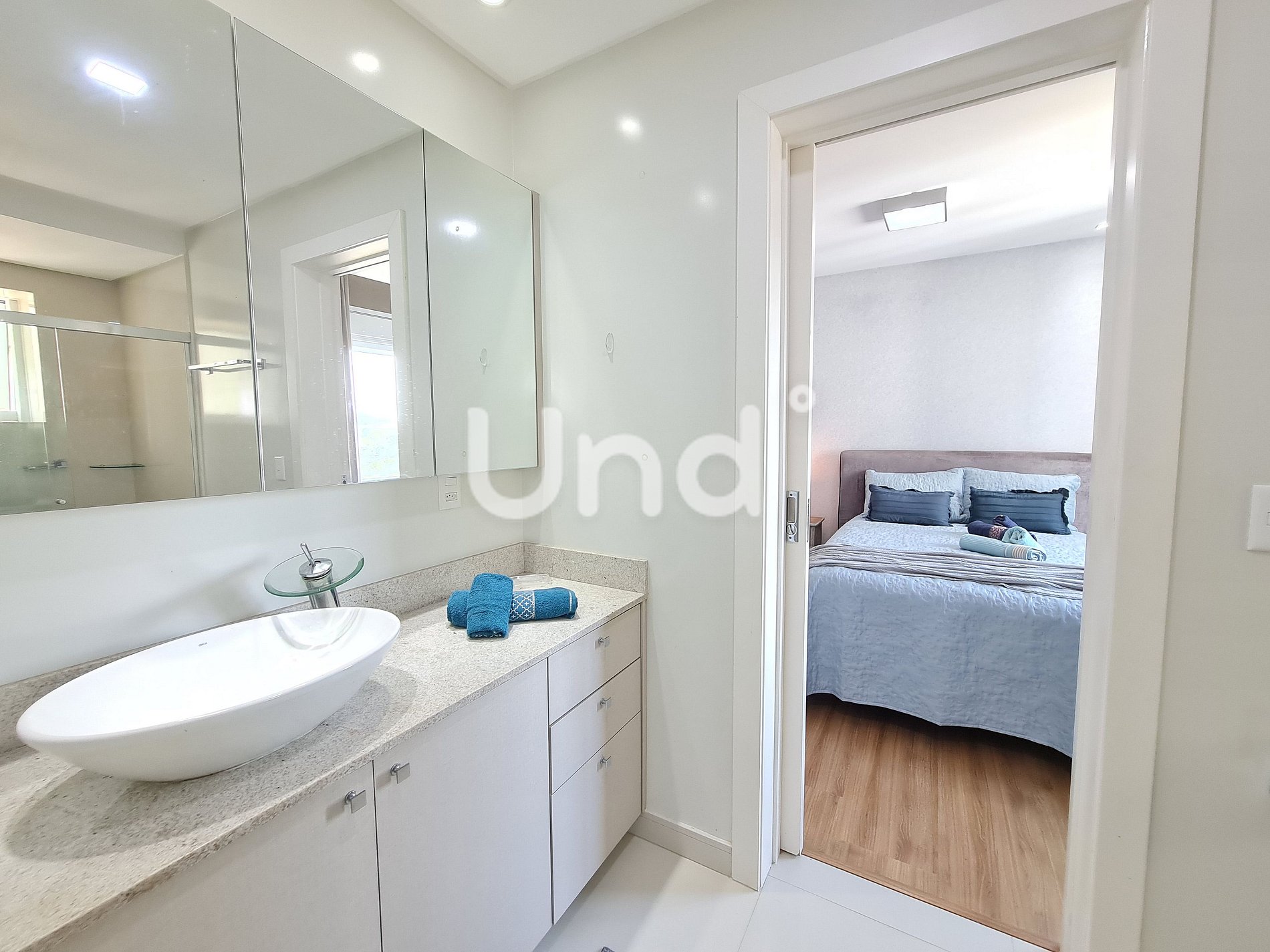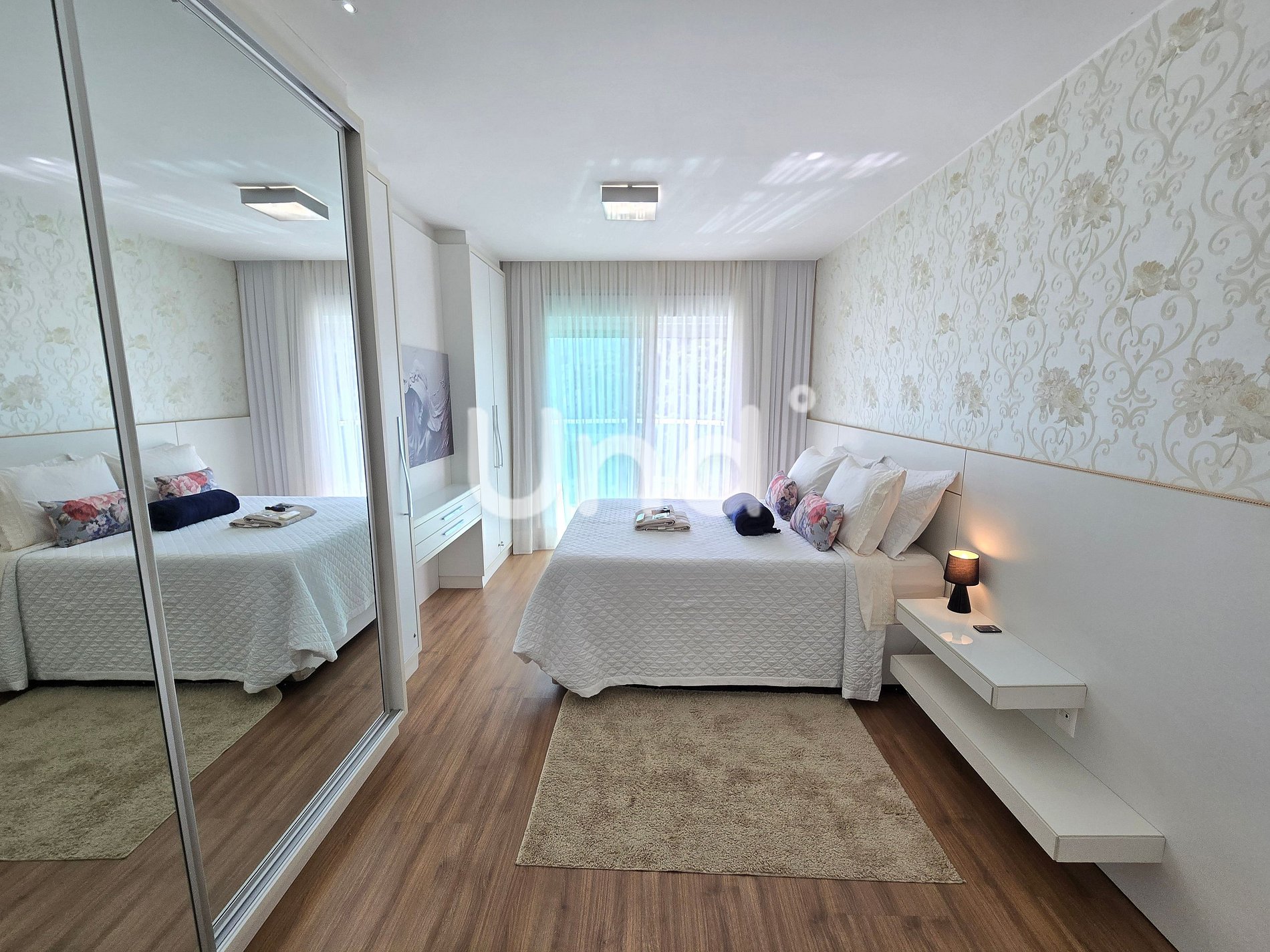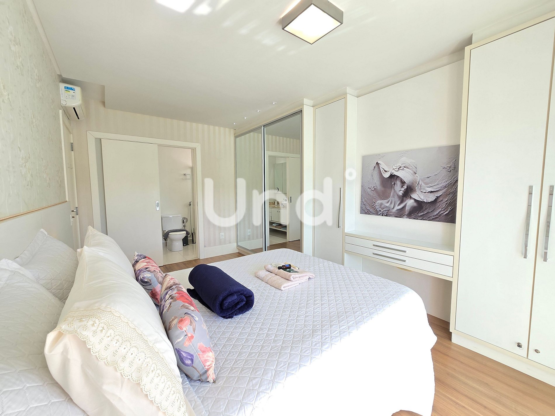 1 Suíte Master: Cama Queen, guarda-roupa, ar-condicionado (9.000 BTUs), banheiro privativo com chuveiro e cromoterapia, além de sacada exclusiva.