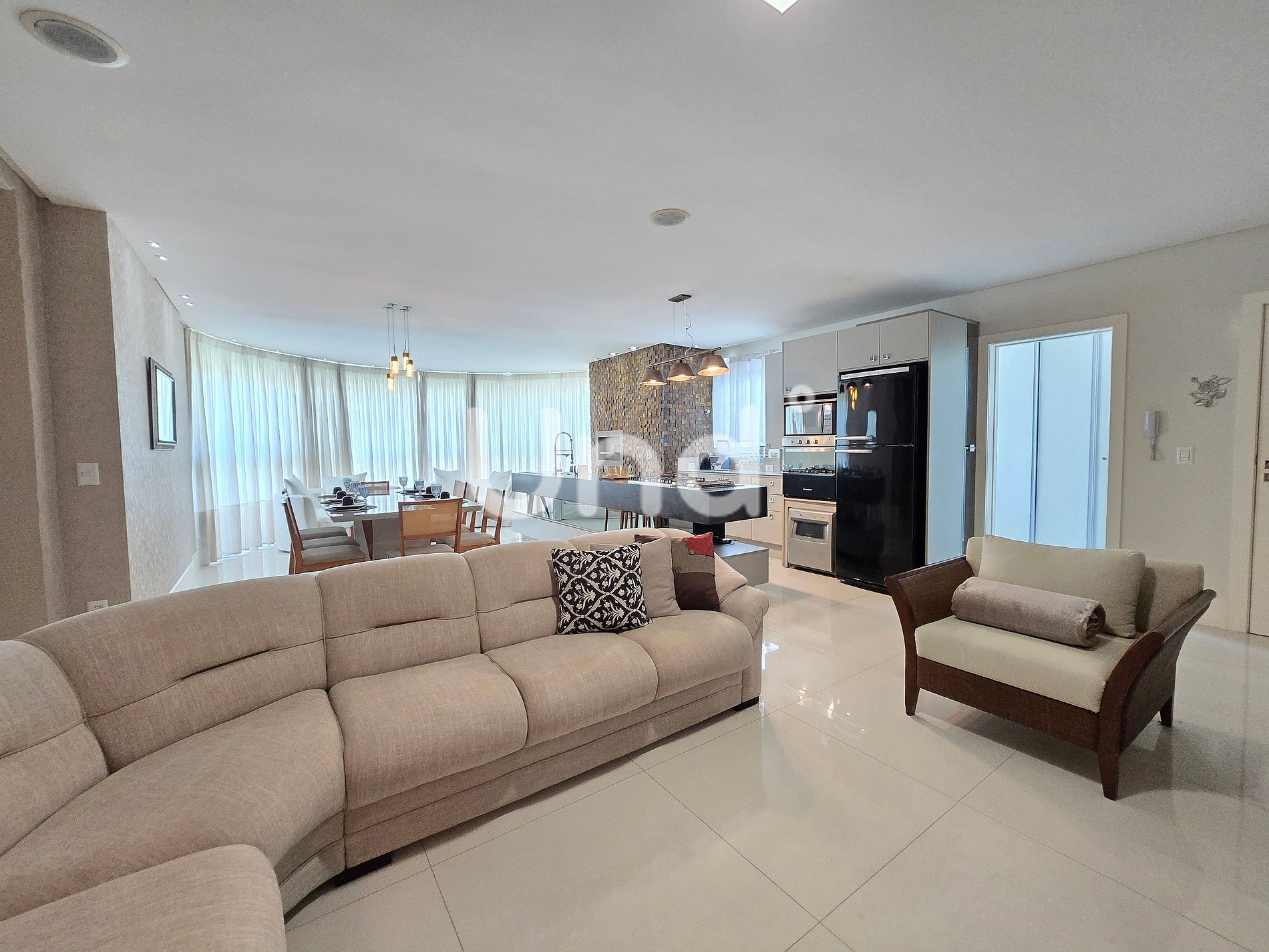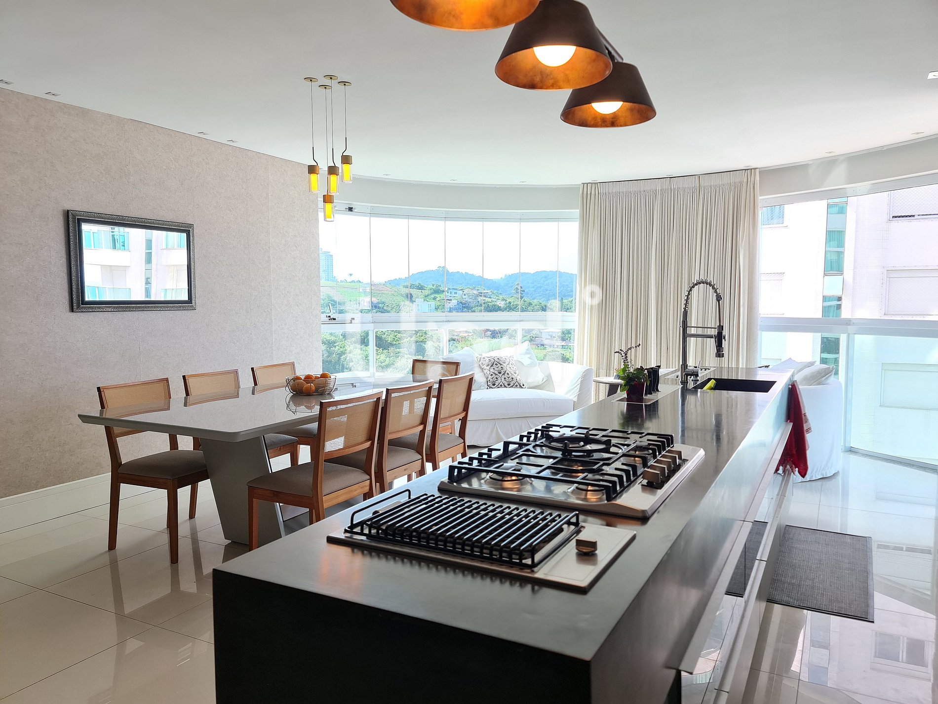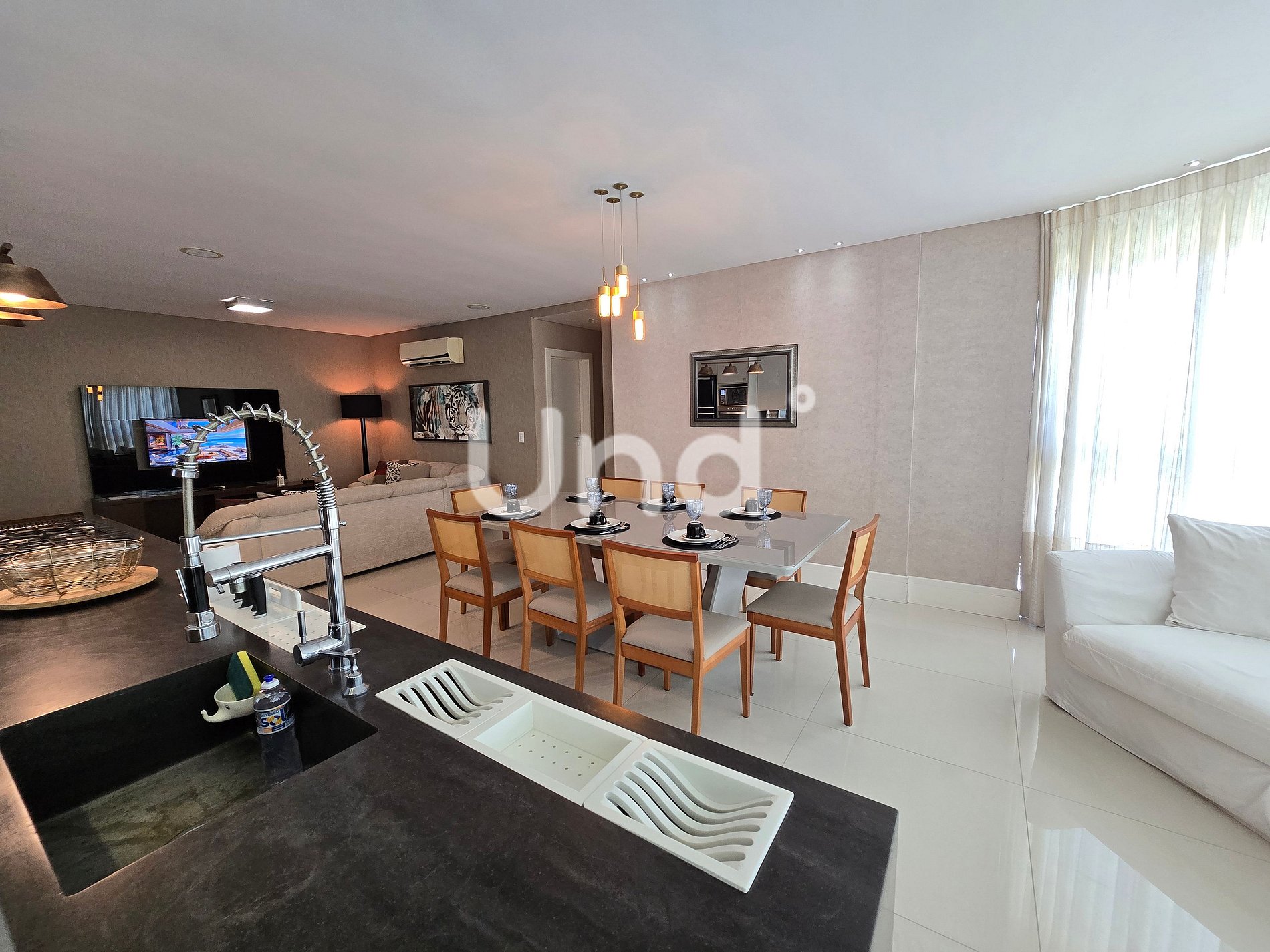 Sala de jantar: Mesa com cadeiras para 8 pessoas, integrando-se perfeitamente aos demais ambientes.