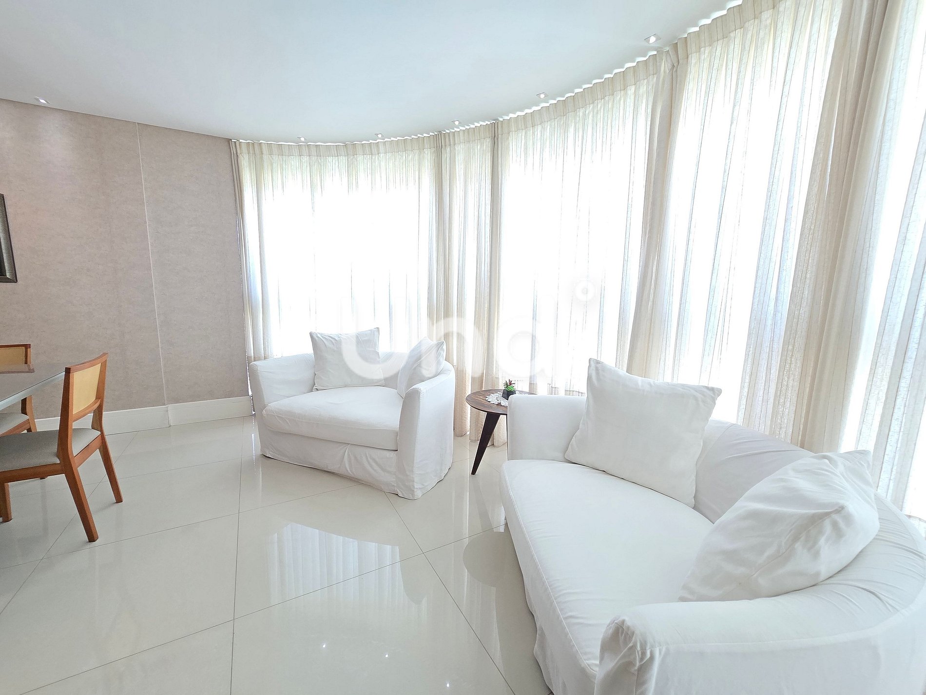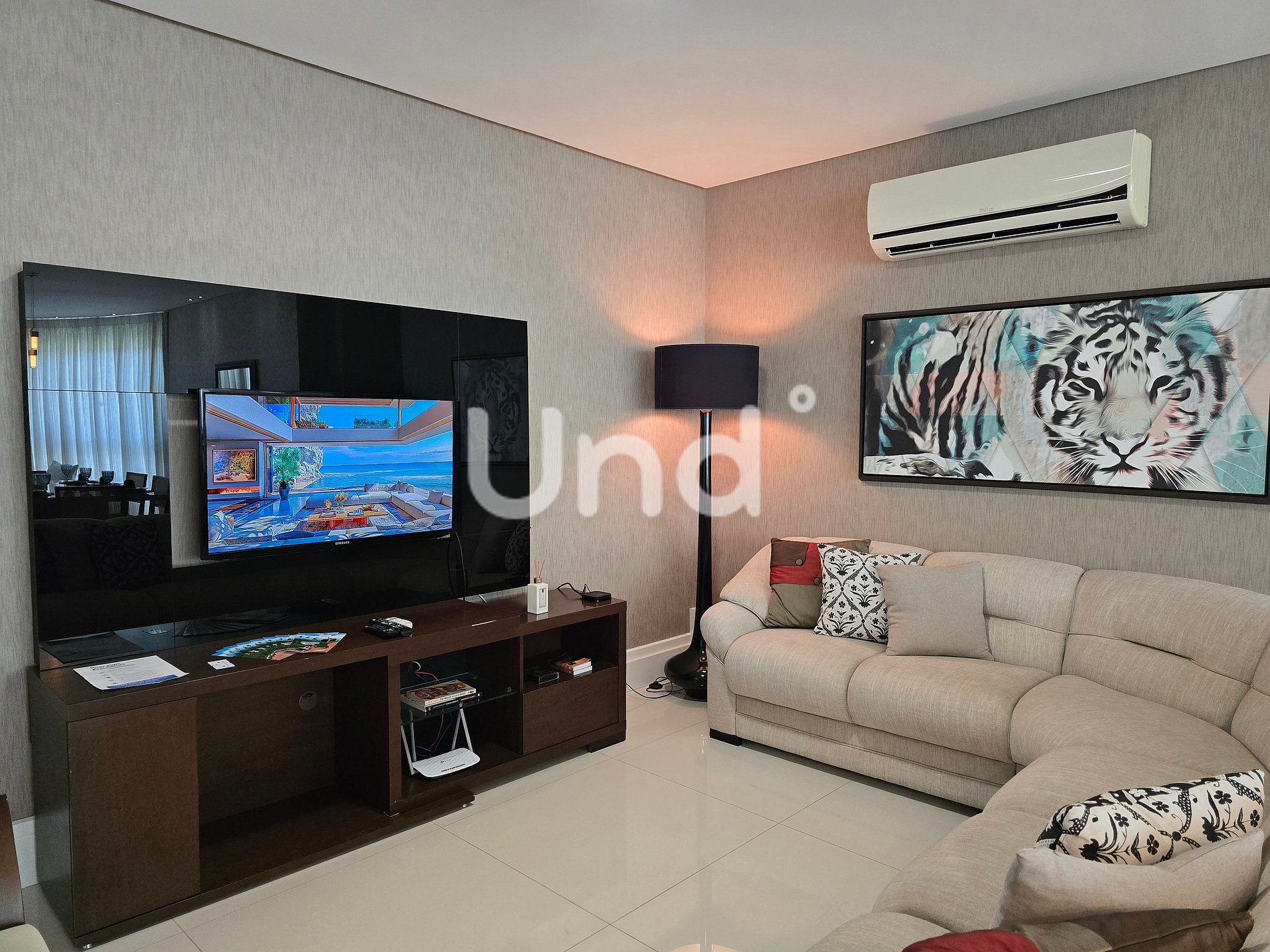 Sala de estar: Sofá, poltronas e ar-condicionado (18.000 BTUs).