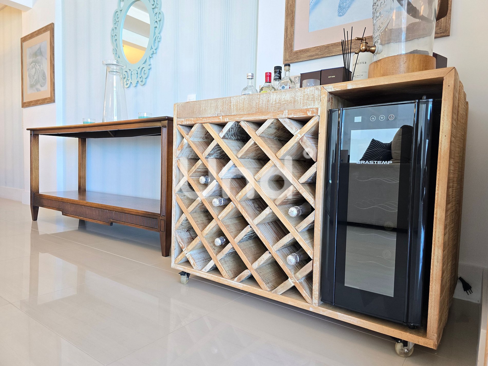 A sala ampla é climatizada e conta com smart TV, Wi‑Fi, adega e poltronas confortáveis, proporcionando um ambiente agradável para relaxar com vista para o mar.