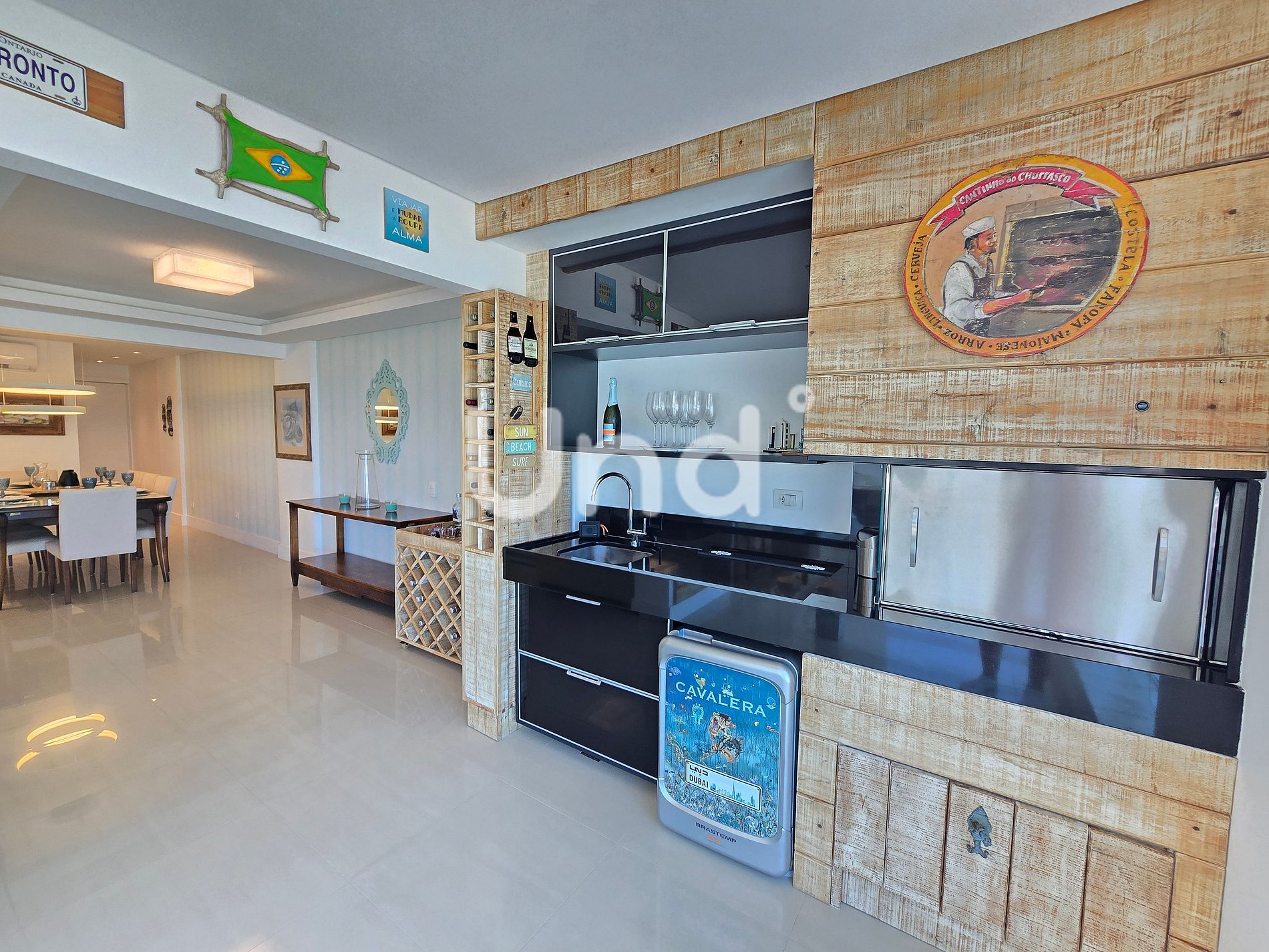 A cozinha é completa e equipada, com forno, micro-ondas, liquidificador, torradeira, panelas, utensílios variados e taças de vinho. Possui também churrasqueira a carvão ajustável, mini frigobar e mesa de jantar para 8 pessoas.