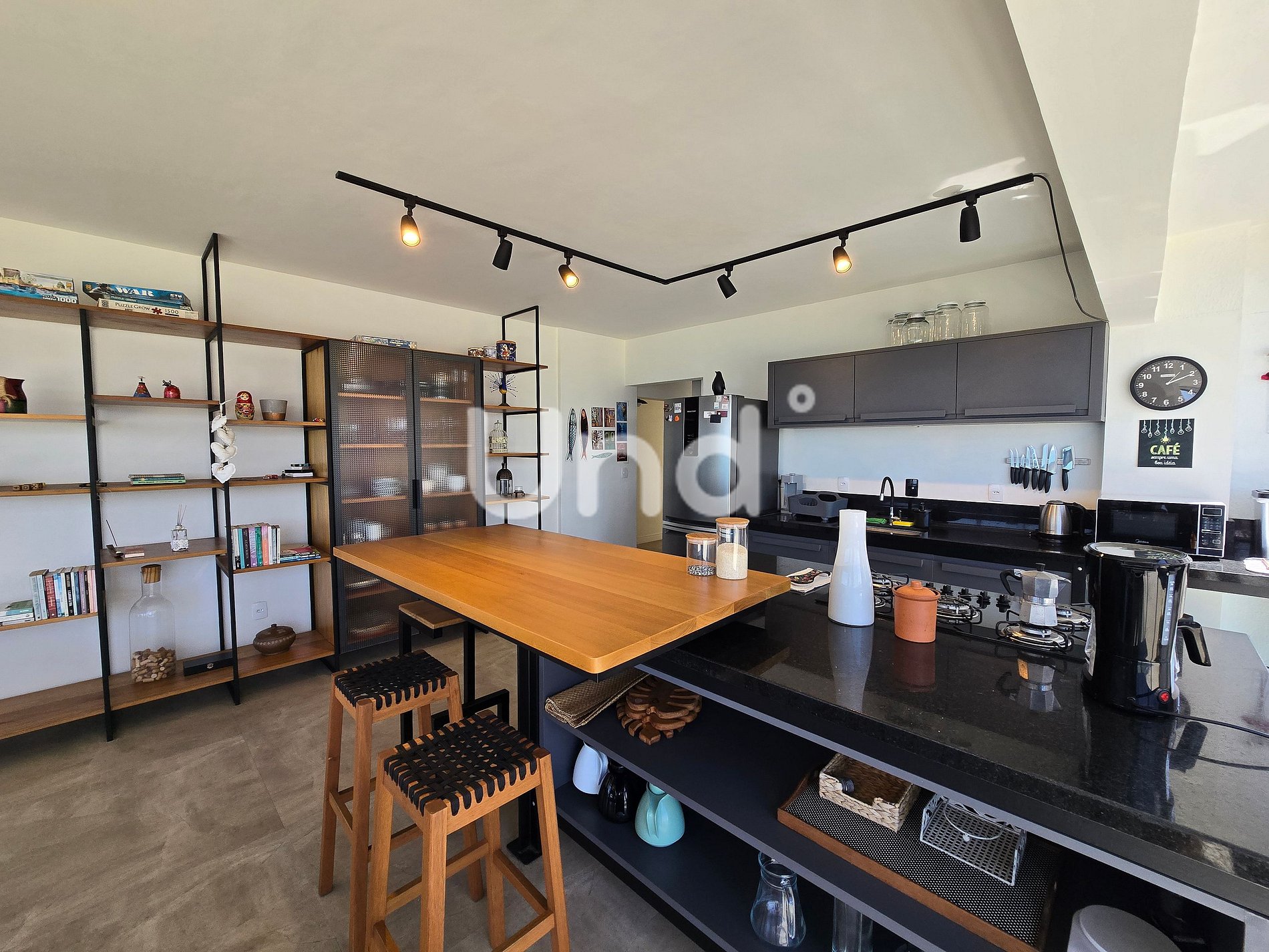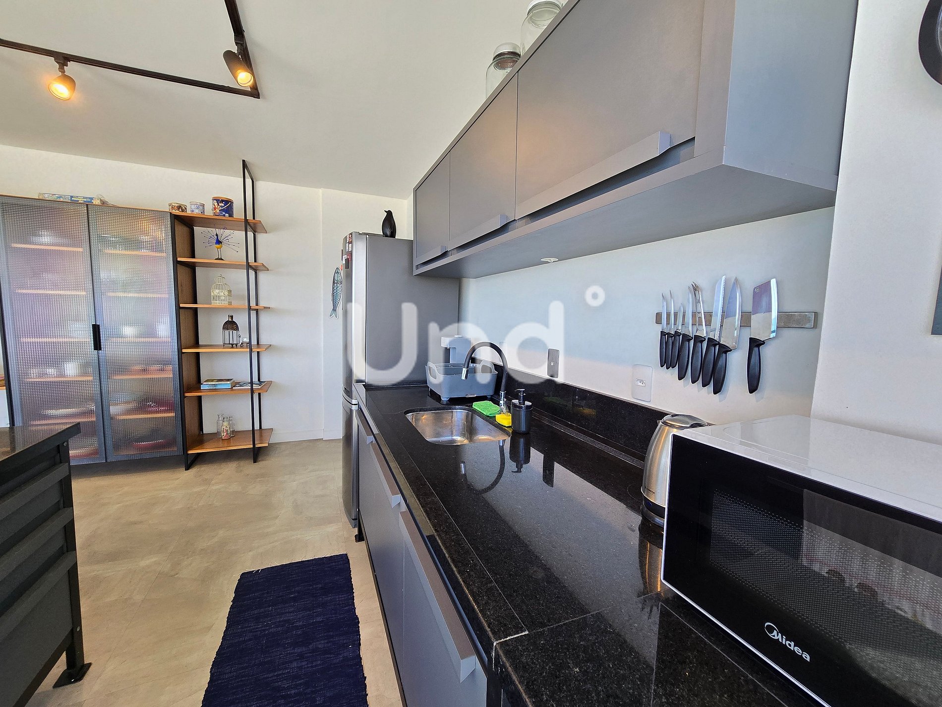 Cozinha integrada à sala de jantar, sala de estar e sacada, criando um ambiente perfeito para socialização. Mesa de jantar para 6 pessoas e bancada americana com cadeiras para aproveitar a vista. Sacada com mesa para 3 pessoas, ideal para relaxar ao som das ondas.