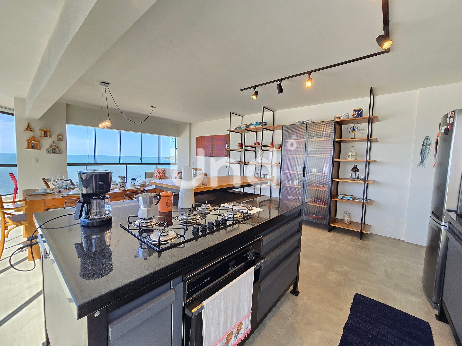 Cozinha integrada à sala de jantar, sala de estar e sacada, criando um ambiente perfeito para socialização. Mesa de jantar para 6 pessoas e bancada americana com cadeiras para aproveitar a vista. Sacada com mesa para 3 pessoas, ideal para relaxar ao som das ondas.