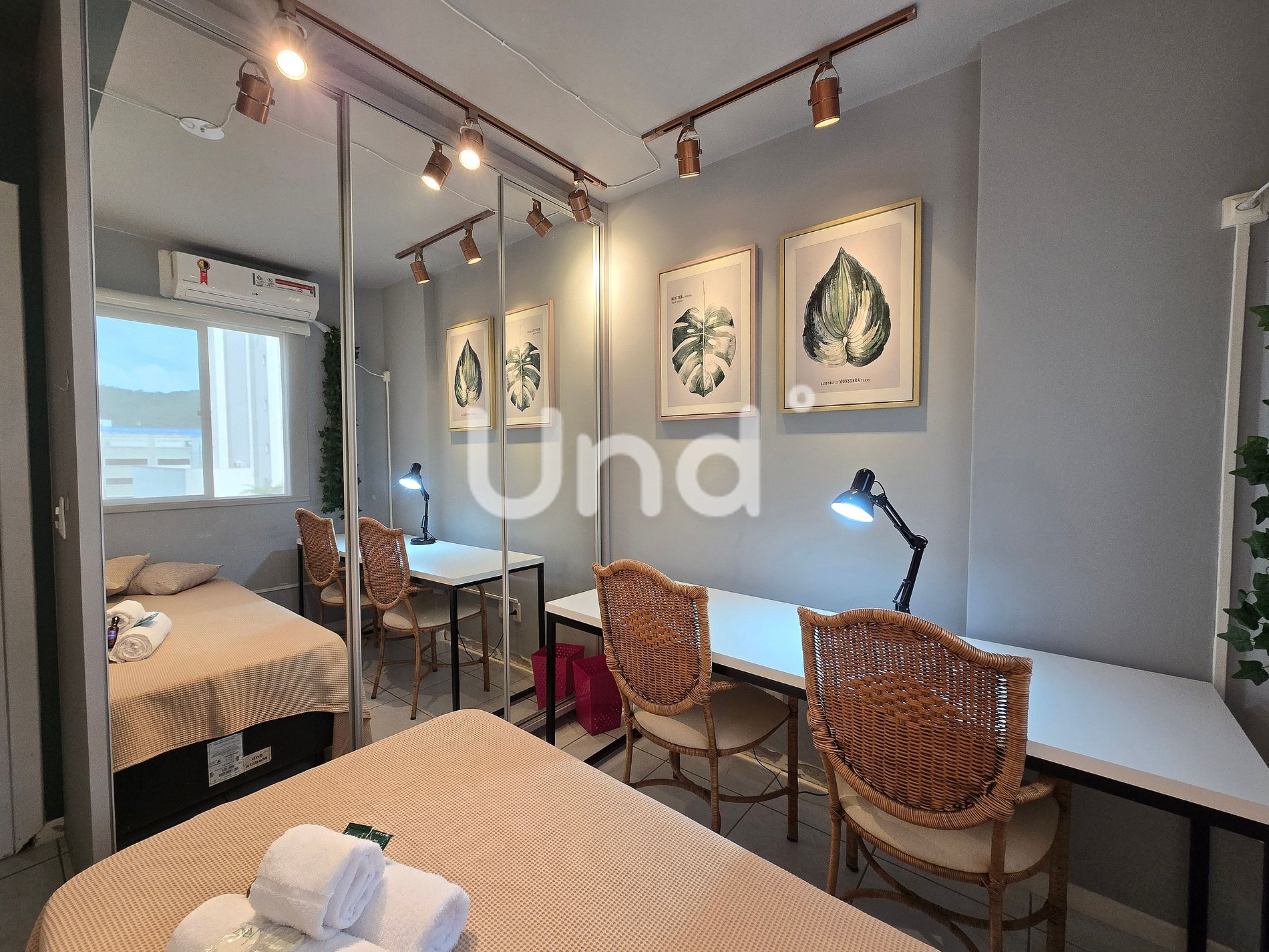 1 Quarto de solteiro: com cama, escrivaninha com cadeira, ar-condicionado e armário.