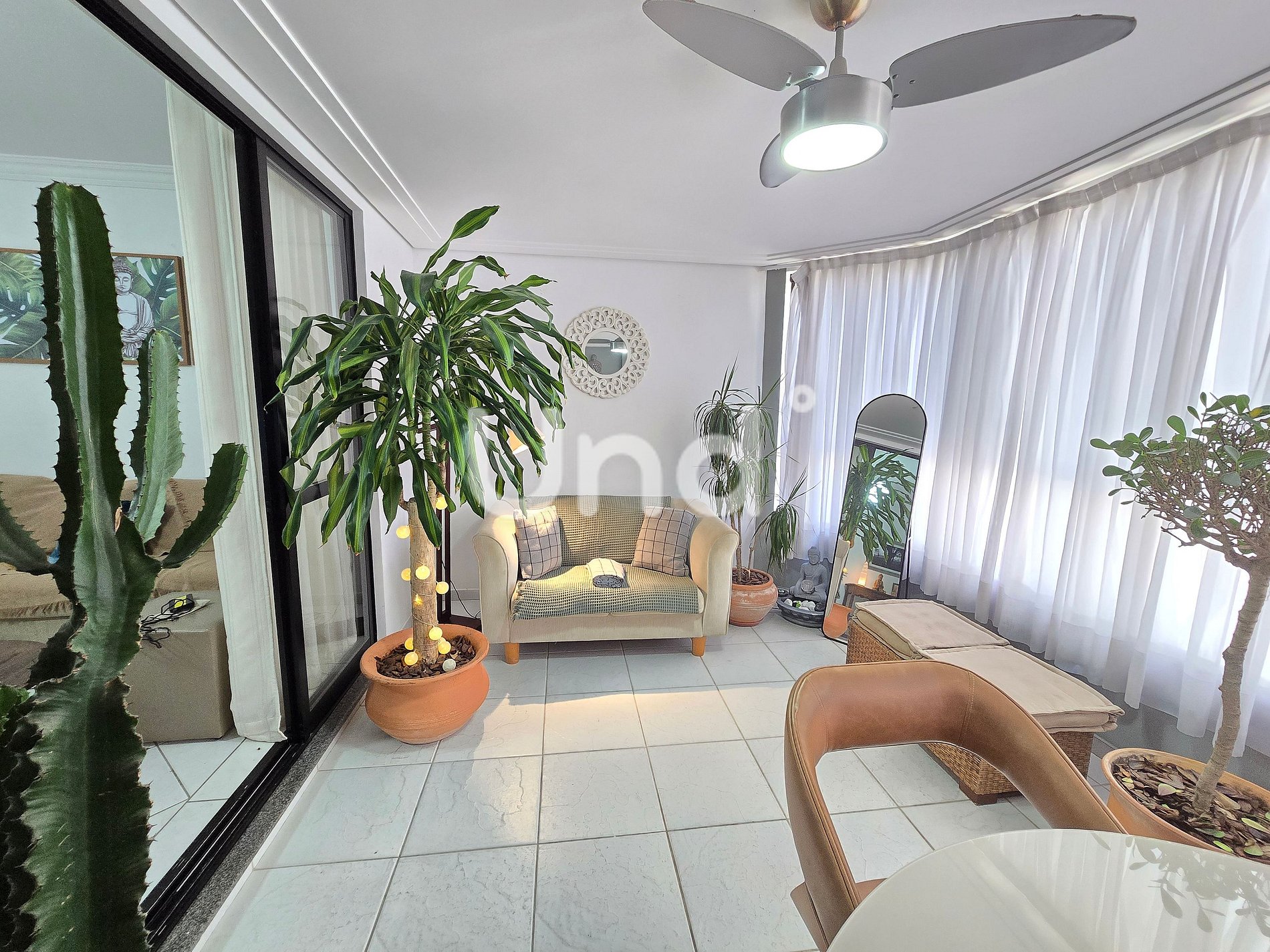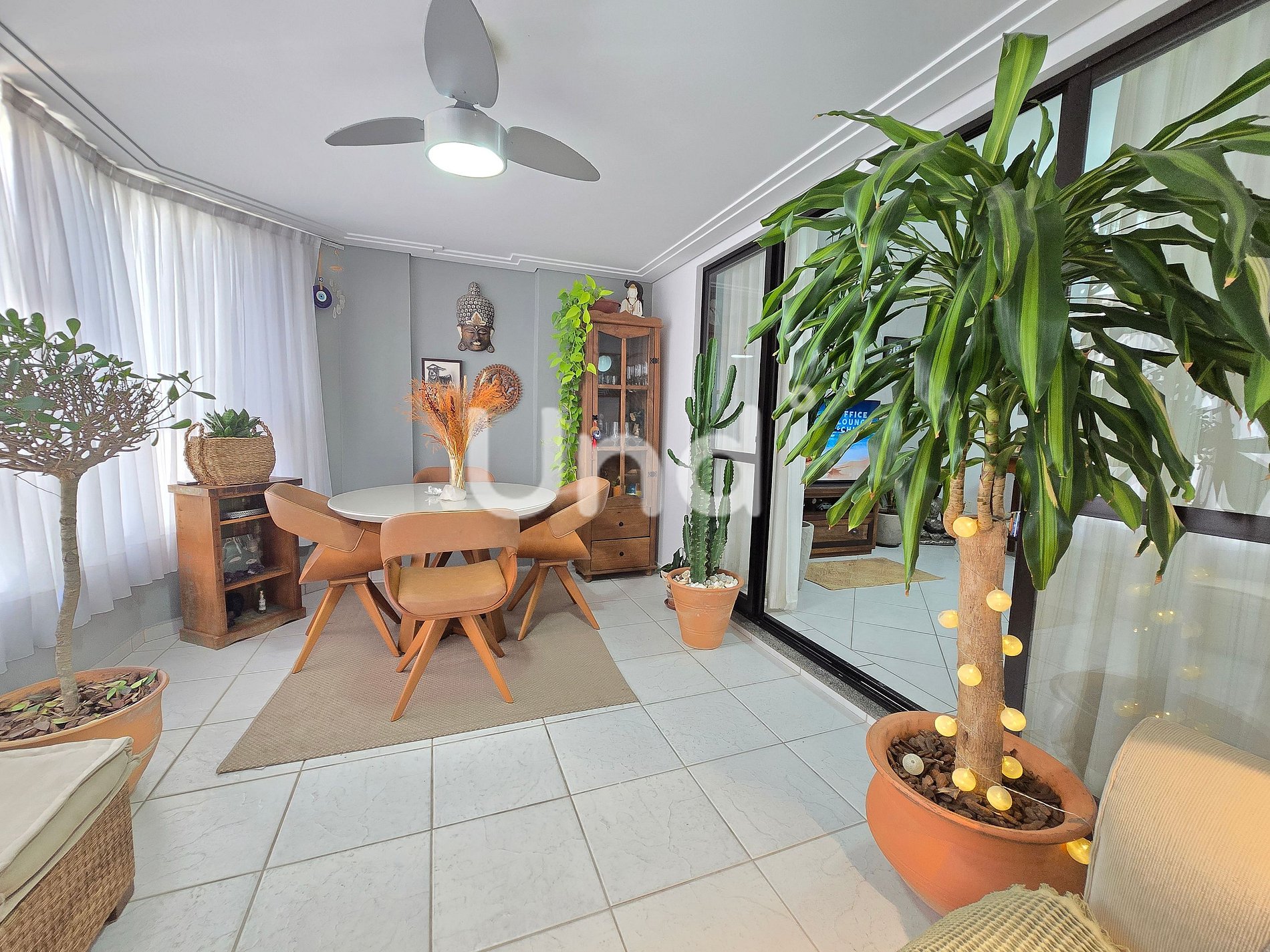 Varanda fechada: sofá, plantas decorativas, mesa redonda com 3 cadeiras e cortinas.