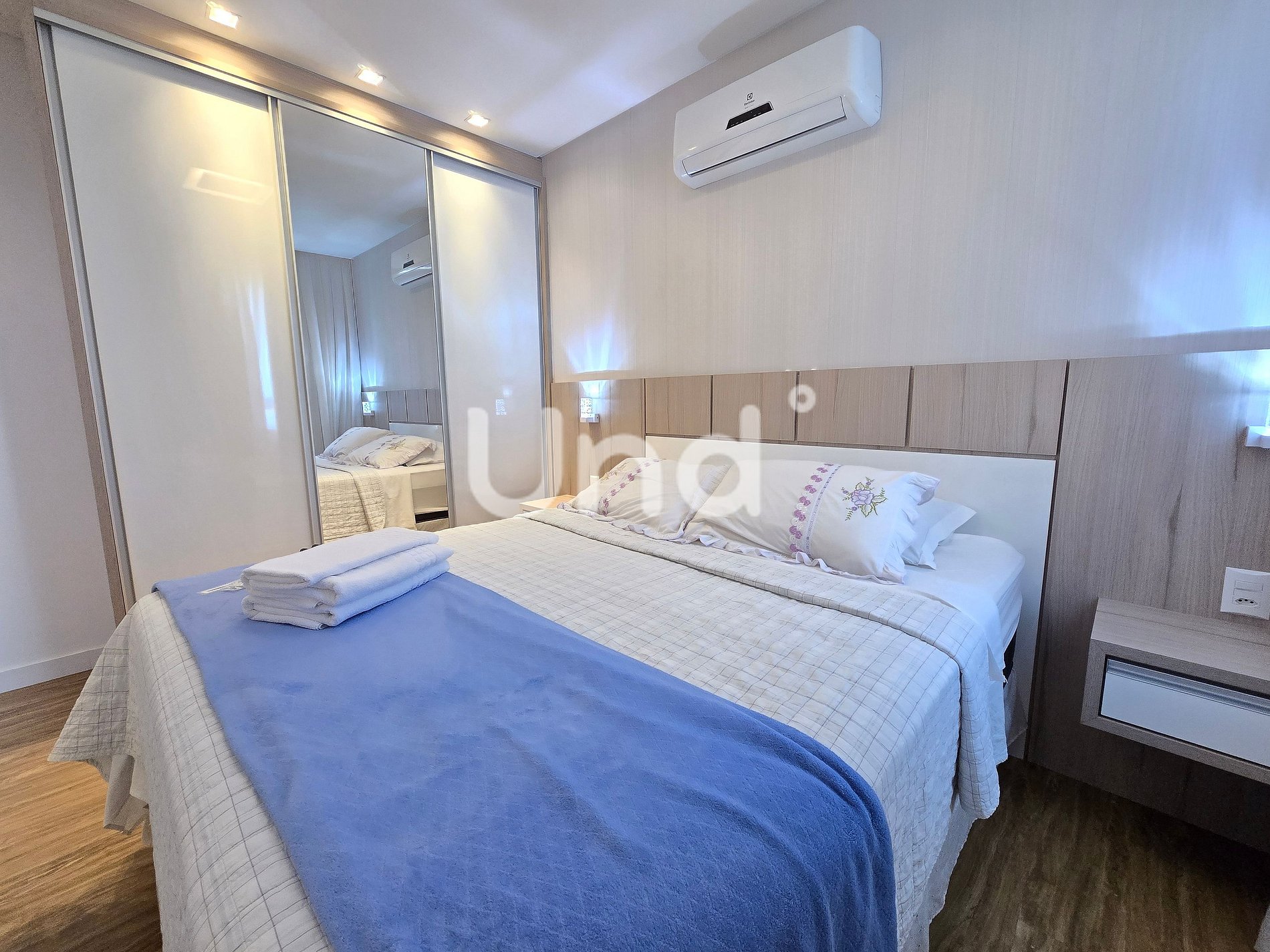 O imóvel conta com 3 suítes climatizadas, sala integrada à sacada com churrasqueira, cozinha completa e área de serviço equipada. Todos os ambientes possuem ar-condicionado.